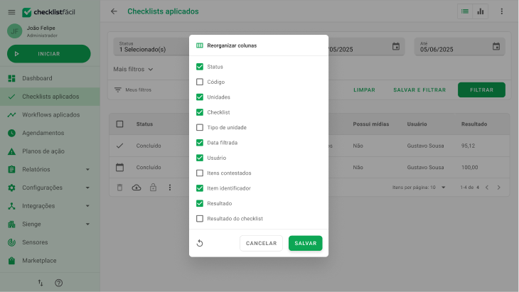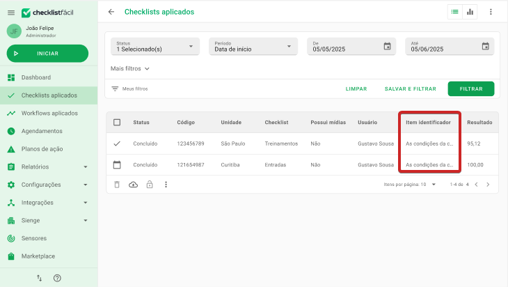 O Item Identificador do Checklist permite definir um item específico cuja resposta será exibida diretamente nas listagens. Essa funcionalidade resolve a dificuldade de diferenciar checklists que possuem o mesmo nome ou unidade, mas conteúdos internos distintos.