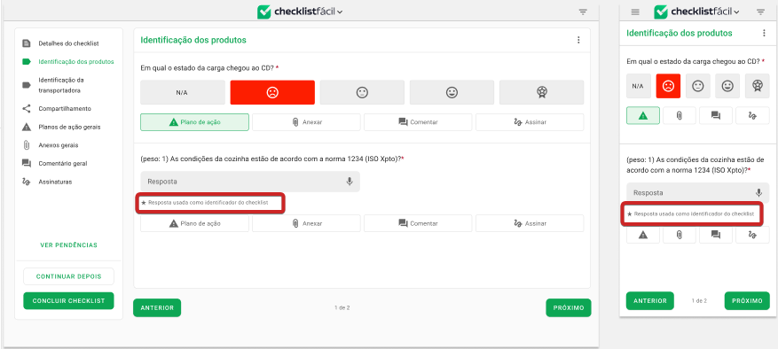 Durante o preenchimento (Web ou App), o item identificador exibe uma tag visual com o texto "Resposta usada como identificador do checklist" logo abaixo do campo. Essa indicação é meramente informativa e não altera regras de obrigatoriedade.
