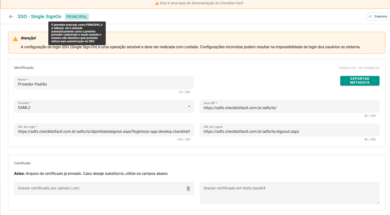 Nome do Provedor: Escolha um nome claro e reconhecível. Deve ser único na conta, não pode ser "Checklist Fácil", "ADFS" ou "SSO" e possui limite de 255 caracteres.