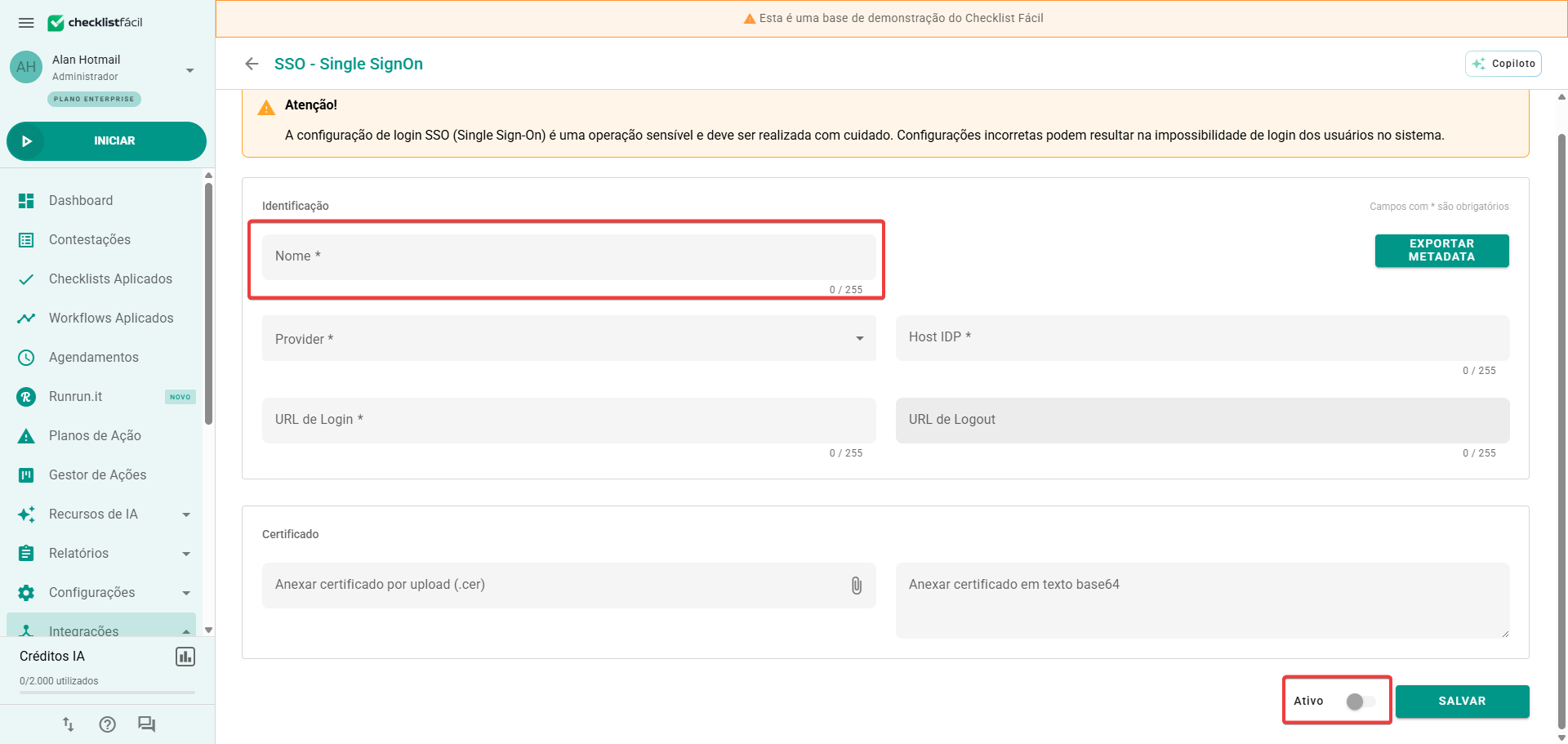 Atenção: configurações incorretas de SSO podem impedir o login dos usuários.
