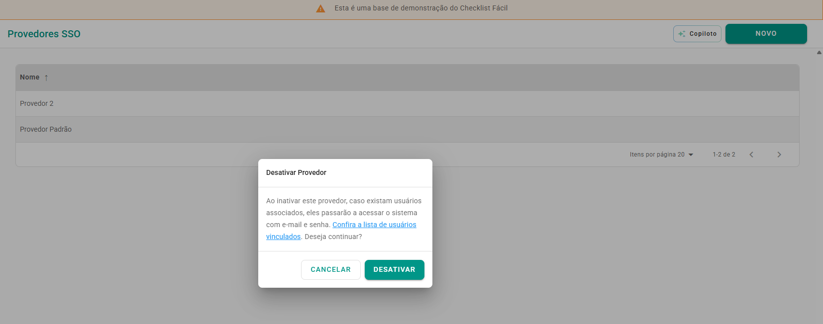 Ativar ou reativar um provedor: Somente provedores Ativos aparecem como opção na configuração de usuários. Em caso de reativação de um provedor que já teve usuários vinculados, a mensagem informa que esses usuários poderão voltar a acessar por ele.