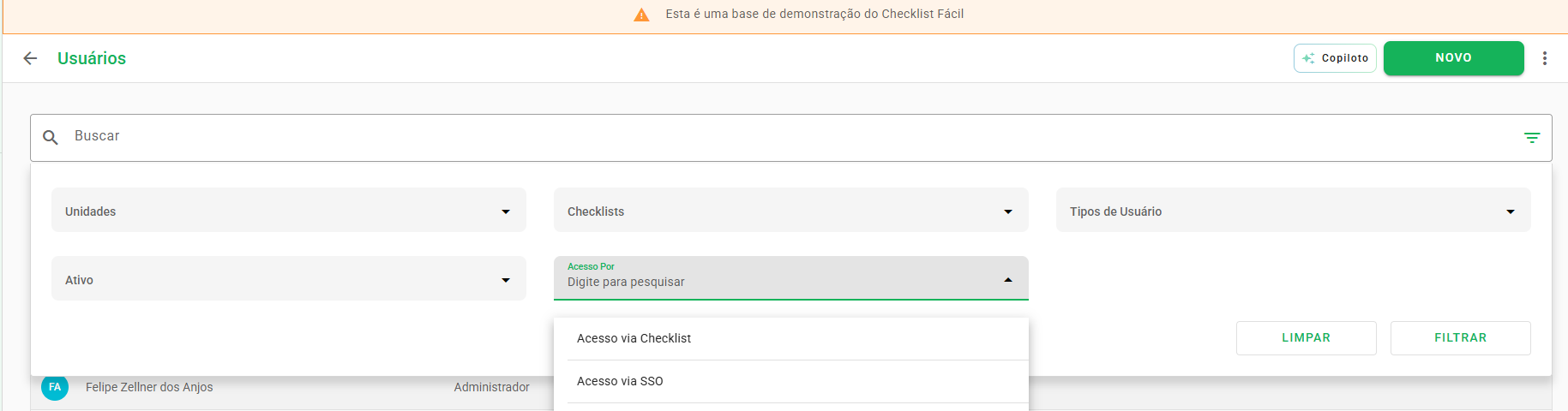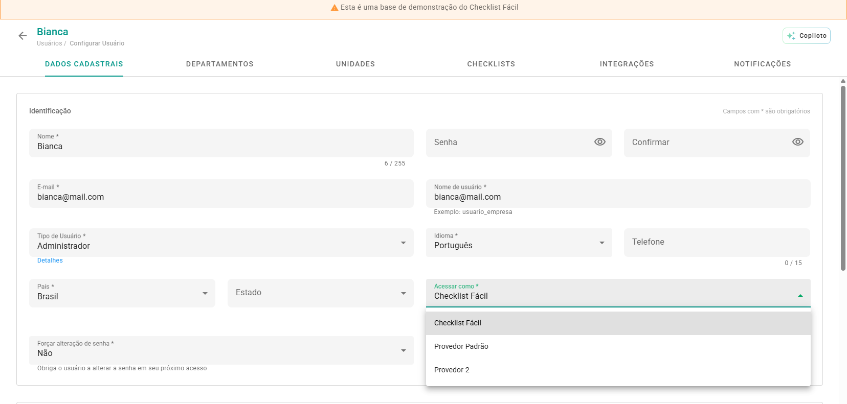 Interface de Usuário: No cadastro ou edição de usuários, surgirá o campo "Acessar como". Selecione o provedor desejado ou escolha "Checklist Fácil" para acesso padrão via e-mail e senha.